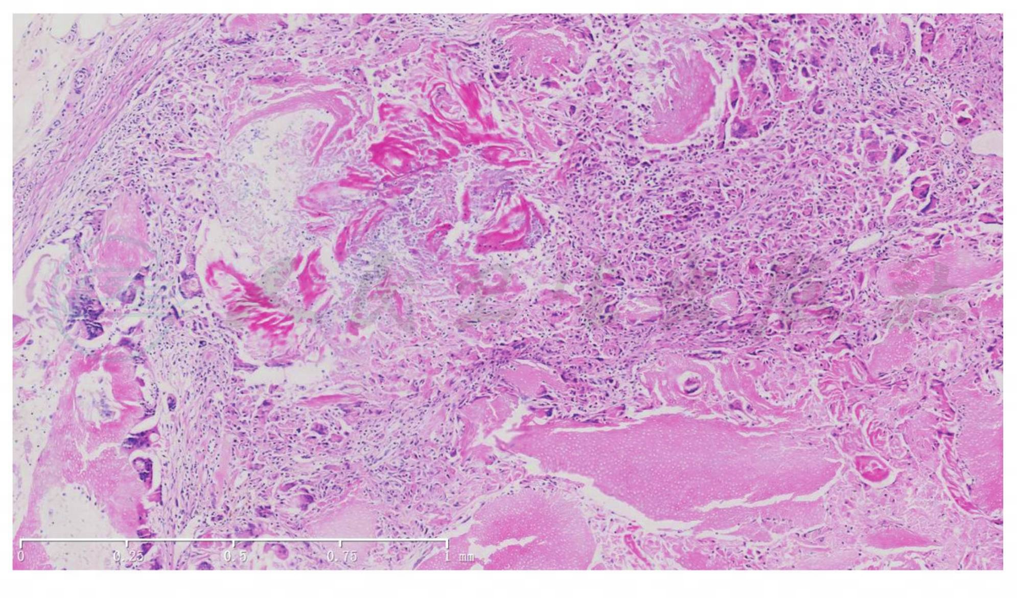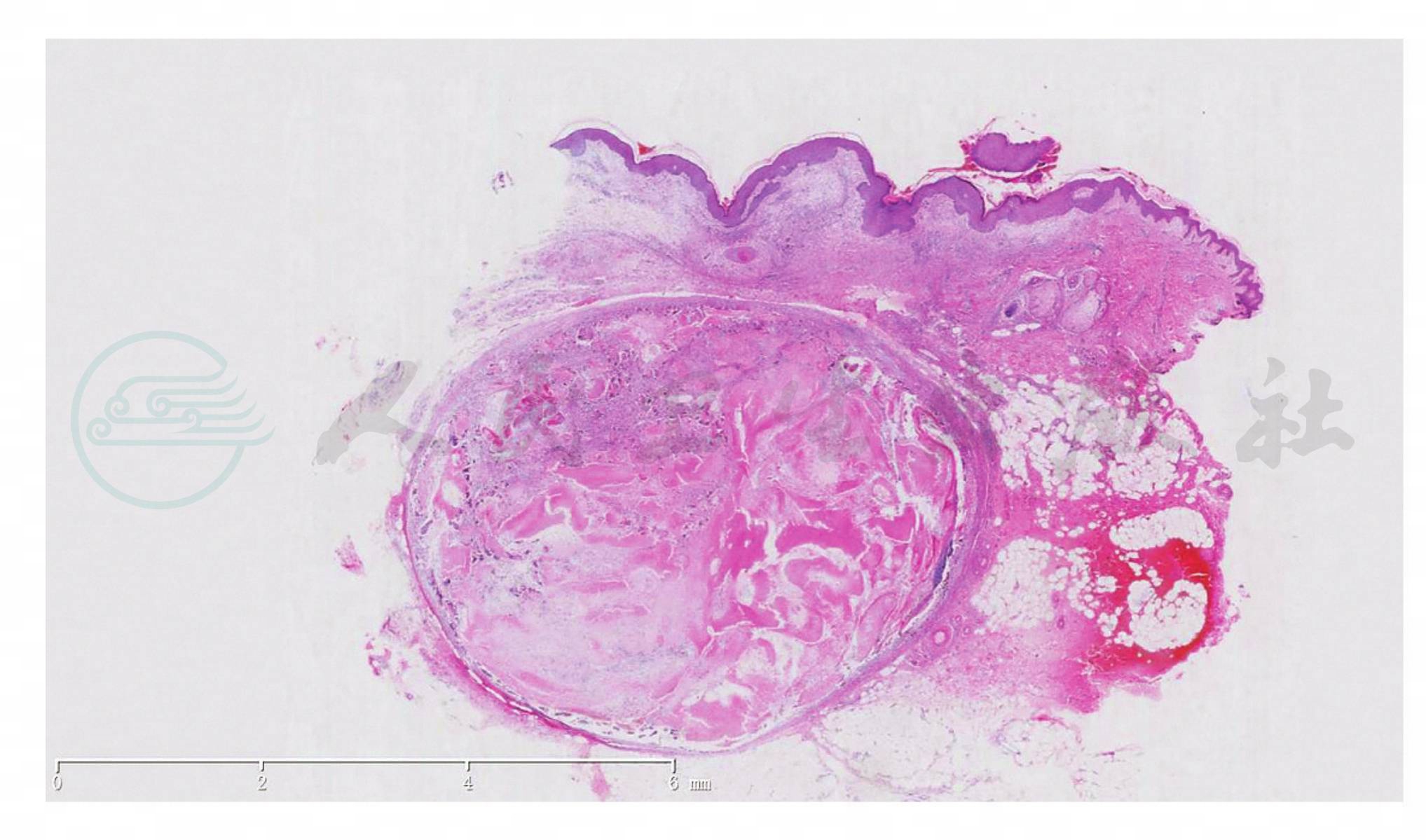 早期皮损显示明显的有丝分裂活性,但无病理性核分裂,表示皮损处于快速生长阶段,而无恶变倾向。随着肿瘤的成熟,基底样细胞转化为影细胞,胞质呈强嗜酸性,核变小,染色质丰富。最后,核仁消失,有片状密集嗜酸性角蛋白碎片残留,其中影细胞轮廓模糊不清,常见巨细胞。