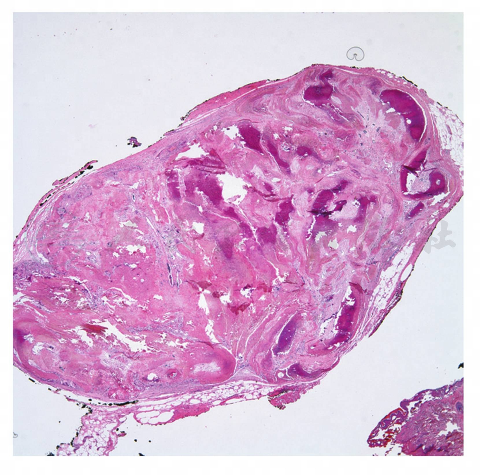 角化主要发生于毛发,但有时可见点状表皮角化灶。某些肿瘤存在另一特征性改变,其基底样细胞及间质内组织细胞内常见黑素颗粒。80%的皮损区域有钙盐沉积,成熟区域中更为常见。病变中常见影细胞的嗜碱性颗粒,偶见钙化大团块,20%的患者会发生骨化现象。