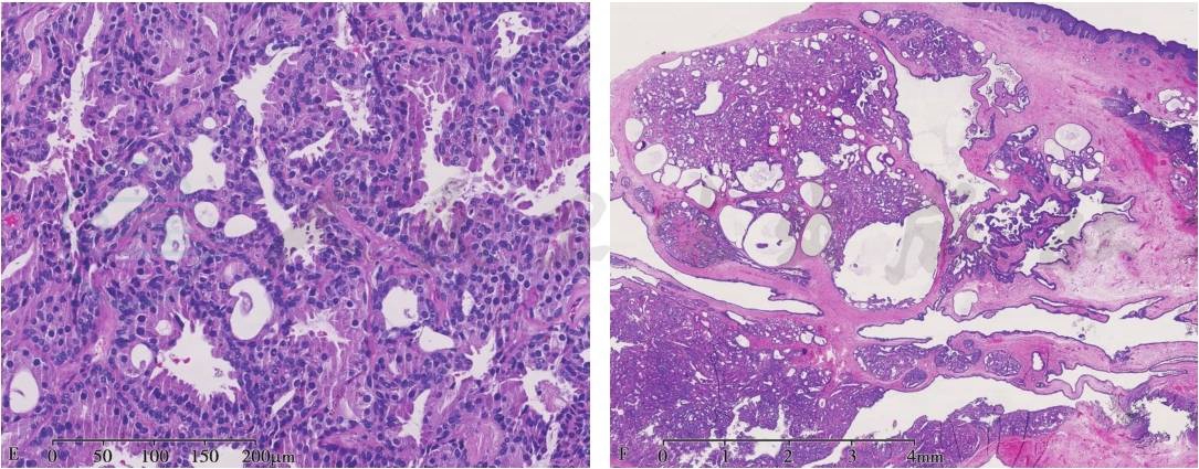 2. 镜下观:肿瘤界限清楚,但无包膜。肿瘤细胞呈腺样或腺管状结构,可有囊性扩张,可伴腔内突起和乳头状增生(图1)。有少量纤维性间质。形态上近似耵聍腺,但缺乏正常耵聍腺的小叶结构。