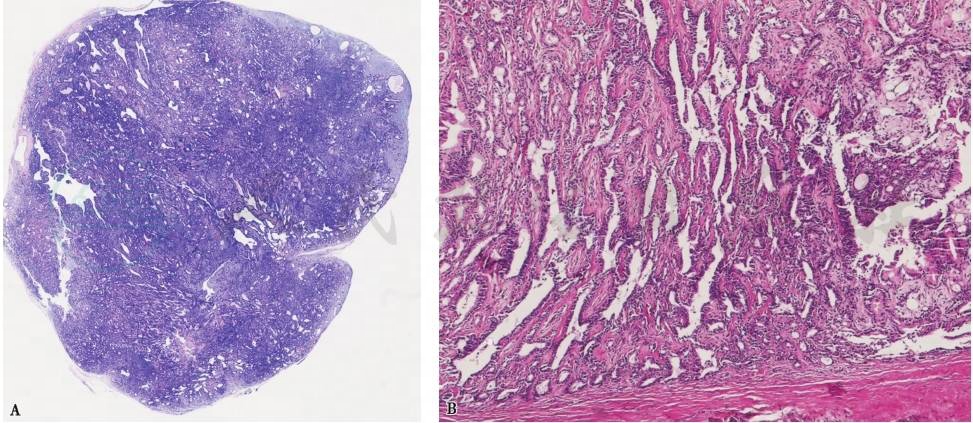 腺上皮由两层细胞构成,内层细胞可见顶浆分泌,耐酸的荧光黄蜡样色素,胞质丰富、呈酸性,核圆,染色质致密。外层肌上皮细胞可增生,但并不是肿瘤所有部分都明显存在肌上皮细胞。