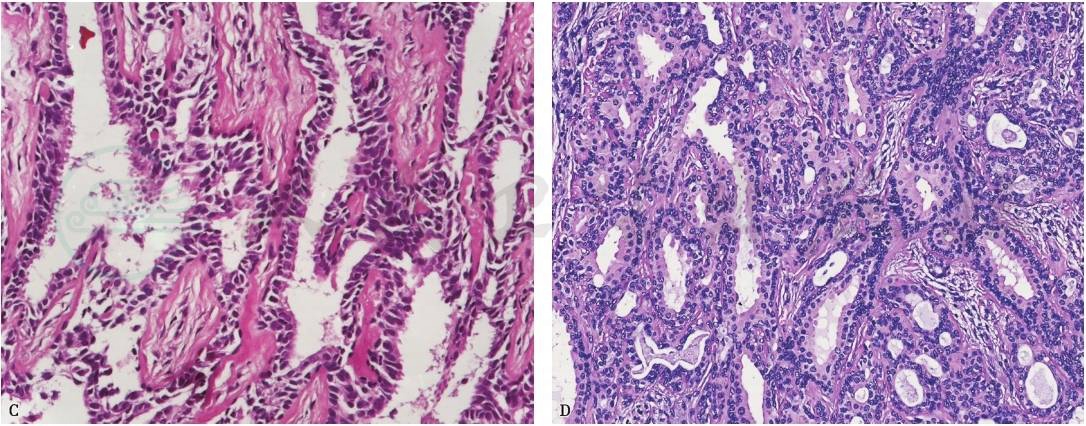 3. 免疫组化染色:内层细胞CK7阳性,外层细胞表达P63、CK5/6、S-100,CD117优先表达于内层细胞。