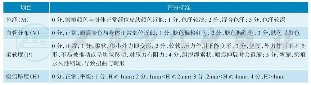 该量表从色泽、瘢痕高度、硬度、痒、敏感或疼痛5个方面对瘢痕的严重程度进行打分评估,得分大于10分为重度,6~10分为中度,1~5分为轻度(表2)。