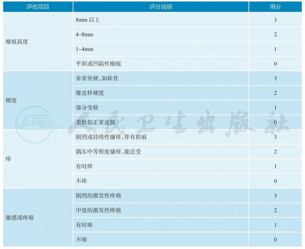 可使用视觉模拟评分法和数字模拟评估工具对瘢痕疼痛或瘙痒不适进行评价。