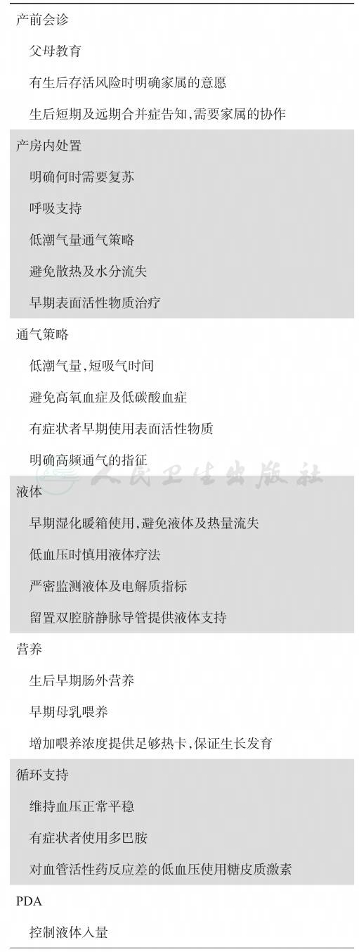 如果条件允许,ELBW儿尽量在有相应诊疗设备的Ⅲ级NICU医院分娩,当然也要权衡宫内转运和出生后转运哪个危险性更大。产前使用糖皮质激素,即使时间紧急无法达到足疗程,以减少新生儿呼吸窘迫综合征(RDS)及其他早产后遗症的发生。