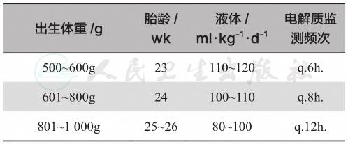 生后第2天给予电解质,包括钠3~4mmol/(kg·d)、钾2~3mmol/(kg·d)及钙50~100mg/(kg·d)。