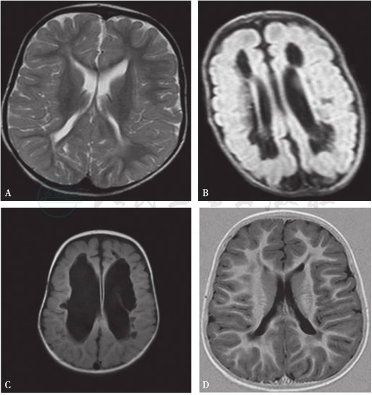 A.脑室旁T2高信号;B,C.脑室旁软化灶,不同程度脑室增宽;D.脑室变形,脑沟加深,脑白质不规则丢失