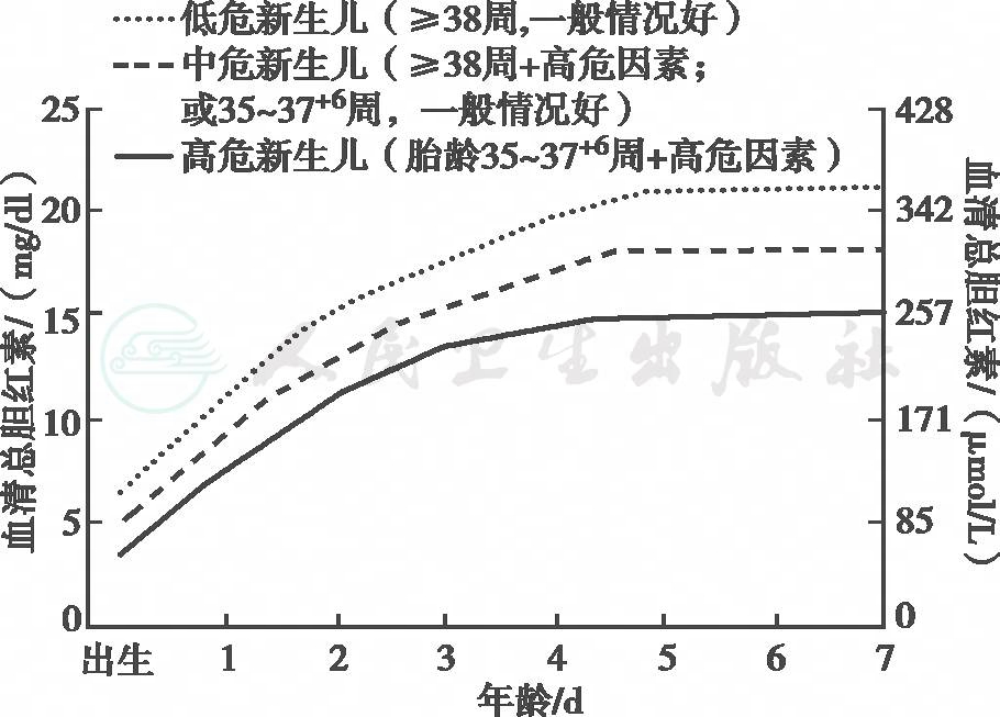 生理性黄疸是排除性诊断,其特点为:①一般情况良好;② 生后2~3天出现黄疸,4~5天达高峰,5~7天逐渐消退,足月儿最迟不超过2周;早产儿最长可延迟至3~4周;③每日血清胆红素升高<85μmol/L(5mg/dl);④血清总胆红素值未达到相应日龄及相应危险程度下的光疗干预标准(见图1)。