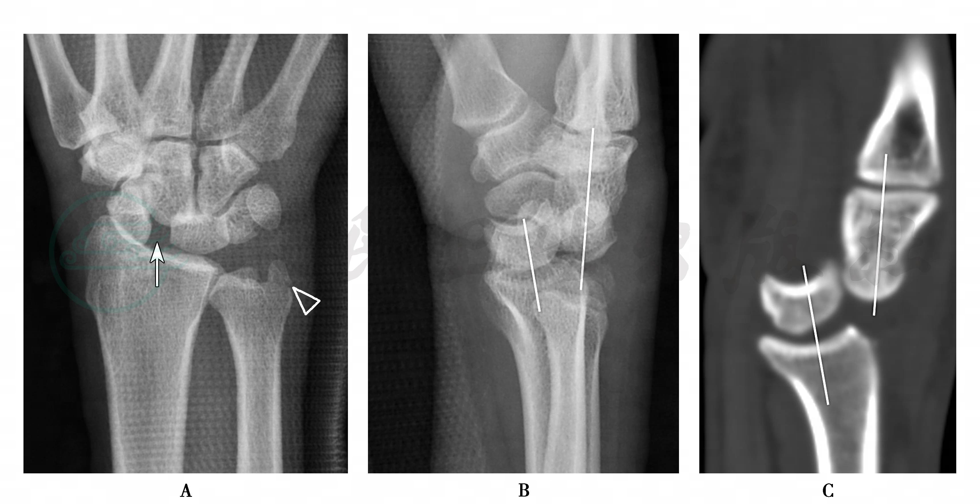 X线片是主要的检查方法(图1),后前位X线片显示Gilula线中断,腕高减小,近排与远排腕骨重叠,尤其是头状骨与月骨的重叠,腕中关节间隙消失。侧位X线片显示桡骨远端、月骨、头状骨及第3掌骨不再共线,月骨位置正常,其余腕骨通常向背侧或掌侧移位,以背侧移位多见,头状骨近端位于月骨后方。
