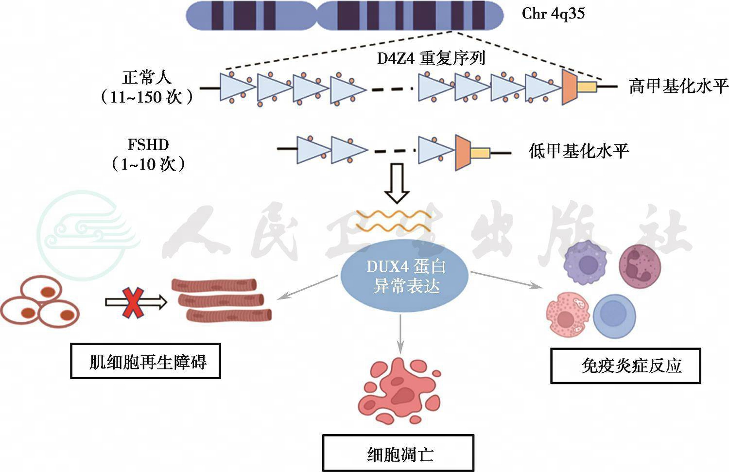 FSHD 1型:①位于4q35区域的D4Z4重复序列缩短,患者的拷贝数为1~10次(正常人的重复次数超过10次);②缩短的D4Z4重复序列位于4qA单体型上;③D4Z4重复序列甲基化水平显著降低。
