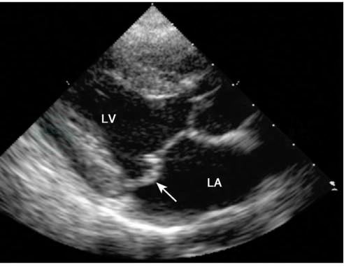 有特征性改变,可观察二尖瓣脱垂的程度、瓣叶形态、瓣环大小、腱索长短粗细、左心房和左心室的大小,可测定心功能和肺动脉压力等,是目前检查二尖瓣脱垂最具有决定性的无创伤性方法。如两个瓣叶均有脱垂,在M型超声心动图上前瓣叶曲线在CD段后突成弧形,后瓣叶曲线则有更大的后突,两瓣叶曲线在该处分离。二维超声心动图胸骨旁长轴切面上可看到二尖瓣关闭时,瓣叶超过二尖瓣环水平(图1)。