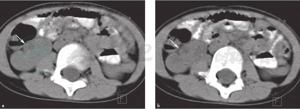 a、b.CT平扫示右肾门指向前外侧(白箭),肾门增宽,肾实质密度、厚度未见异常