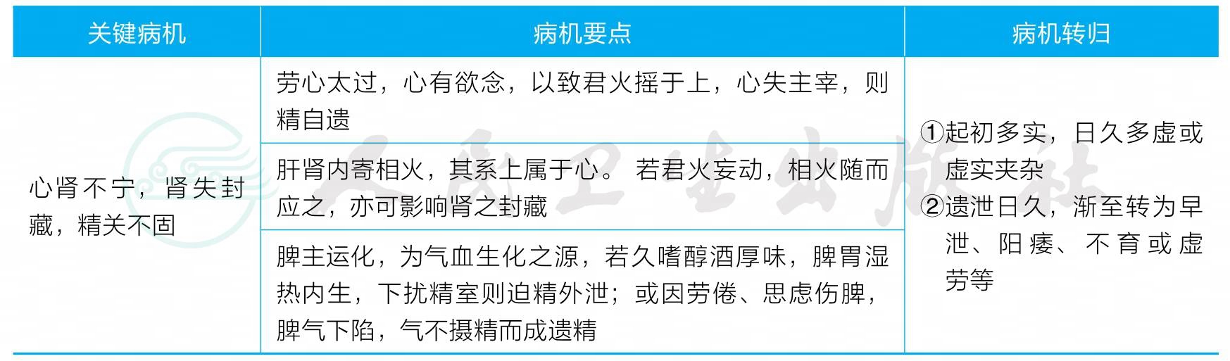遗精的病因主要有劳心太过、欲念不遂、饮食不节、恣情纵欲;基本病机为心肾不宁,肾失封藏,精关不固。