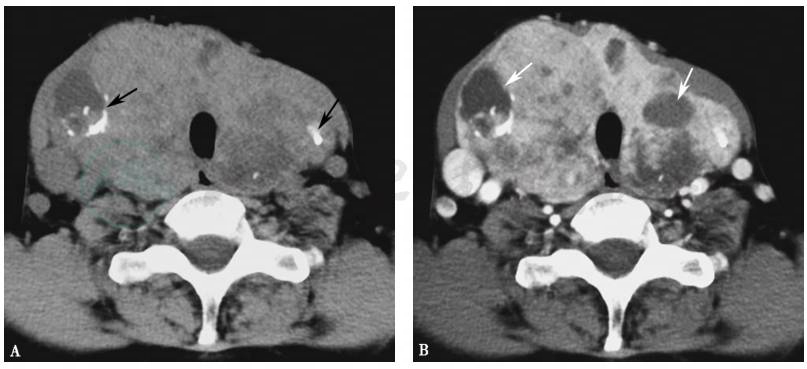 A.CT平扫双侧甲状腺不规则增大,内见多发结节,伴有囊变和钙化(黑色箭头);B.增强扫描多发结节更清楚,大小不一,囊变区无强化(白色箭头)