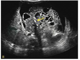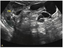 A.右肾受压,肾盂轻度扩张;B.团块内有钙化强回声(箭头)