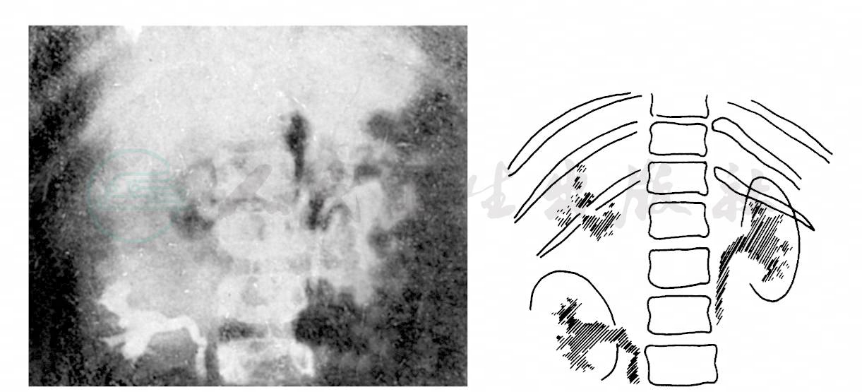 女孩,静脉肾盂造影示右肾向下移位,右11~12肋处可见钙化影