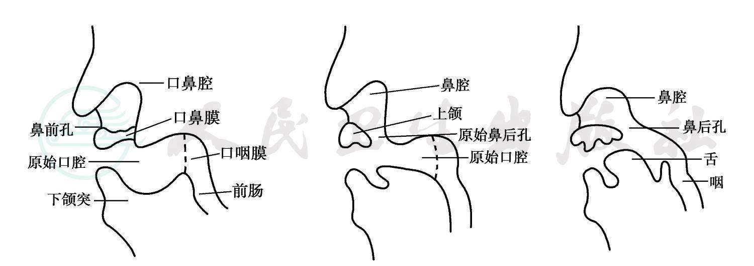 先天性鼻后孔闭锁的病因多数认为与胚胎发育异常有关,较为公认的有如下4个:①颊鼻膜残留;②颊咽膜上部未吸收;③上皮栓块堵塞后鼻孔;④后鼻孔周围组织增生。根据闭锁组织可分为骨性、混合性及膜性闭锁。