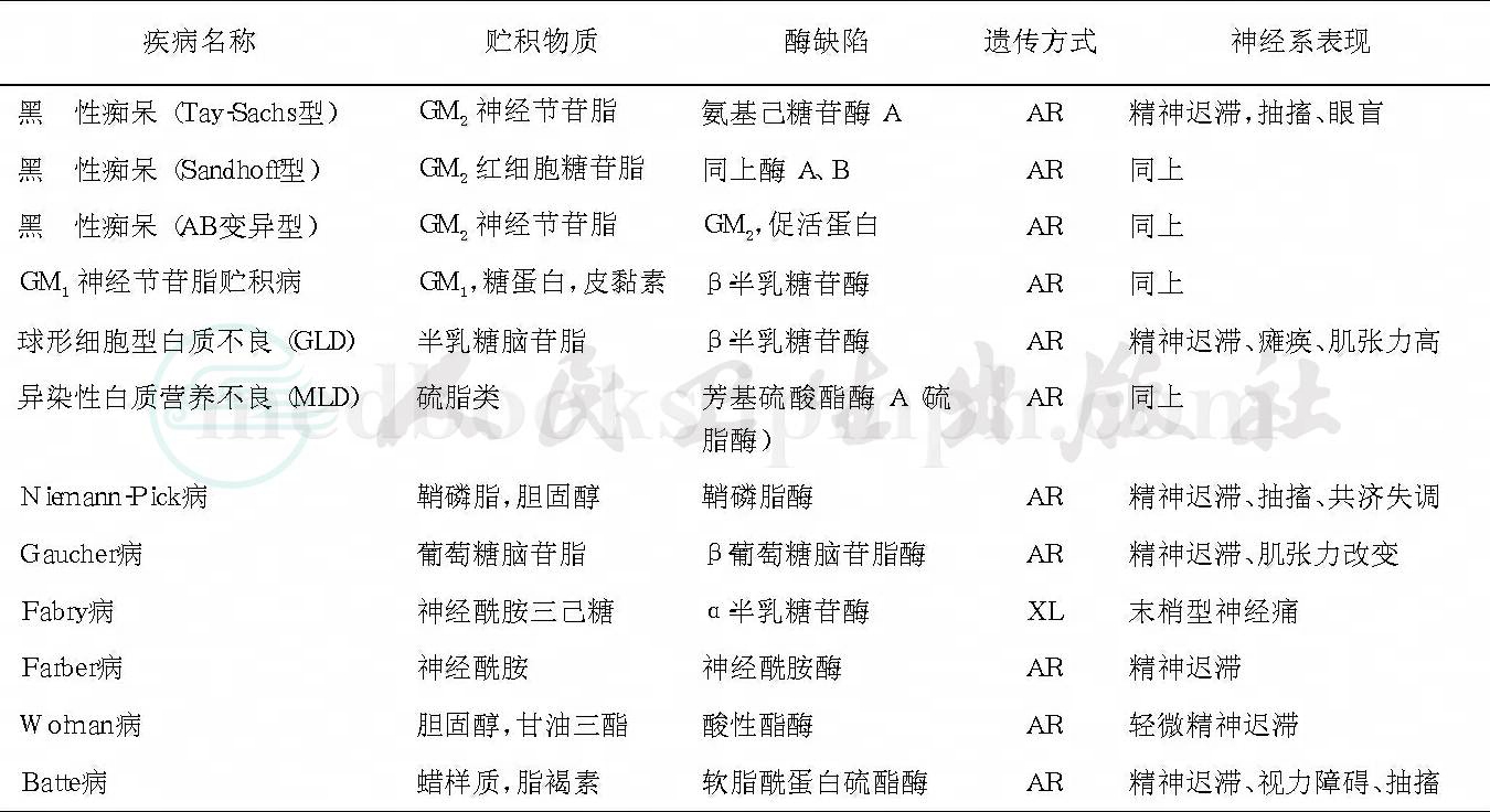 本类疾病主要病因都属于溶酶体内酶活性的缺陷,特别是神经鞘脂类降解过程的异常。神经鞘脂是一大类结构复杂的脂质,主要由长链的羟基胺‐鞘氨醇(sphingosine)所组成,是神经膜的主要结构。本类疾病由于先天性缺乏某些细胞溶酶体中的水解酶,以致许多鞘脂类降解代谢的中间代谢物在细胞内累积,并且影响全身多处细胞和组织的正常功能。表12‐3‐1 简要介绍了各种鞘脂贮积病的类型和相关的代谢缺陷。