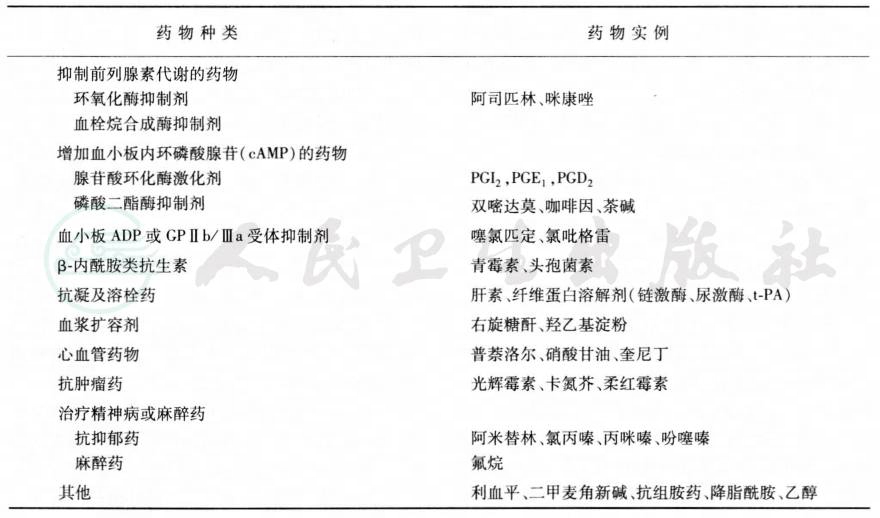 三环类或吩噻嗪抗抑郁药可削弱血小板聚集反应,但一般增加出血危险性。抗肿瘤药普卡霉素的总量达6~21mg时,可延长出血时间和降低血小板聚集反应,可能引起黏膜和皮肤出血。柔红霉素和卡莫司汀可抑制血小板聚集和分泌,但一般不引起临床出血。麻醉药氟烷可引起极轻度的出血时间延长,但对外科手术止血无明显影响。