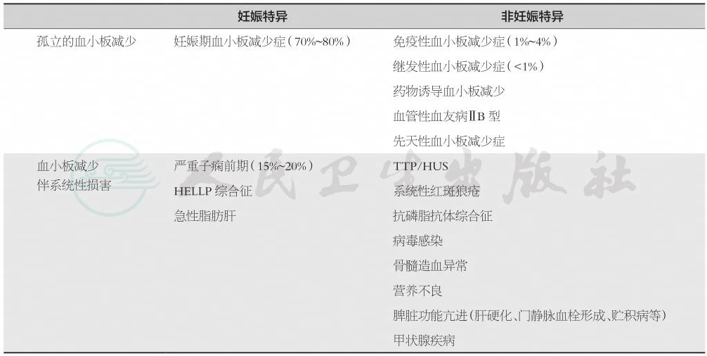 目前有文献将妊娠期血小板减少分为孤立性血小板减少及血小板减少伴系统性损害两类,并按照妊娠特异与非妊娠特异进行病因诊断,其常见的病因见表1。