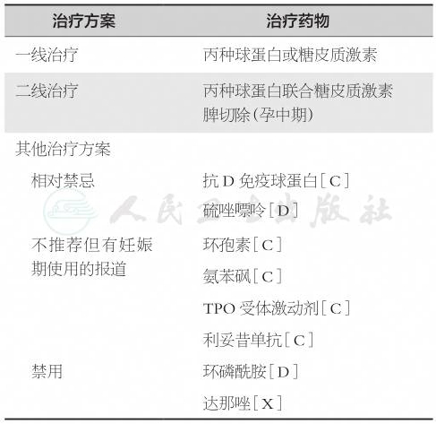 推荐孕期血小板计数<50×109/L者,预产期前2个月可口服泼尼松,以10mg/d为起始剂量,根据血小板上升情况必要时增加剂量;或近足月前开始口服泼尼松15~30mg/d,或输入IVIgG 400mg/(kg·d)持续5天,在血小板计数>50×109/L后计划分娩。对IVIgG或激素治疗均无效者,则在输注血小板条件下计划分娩。