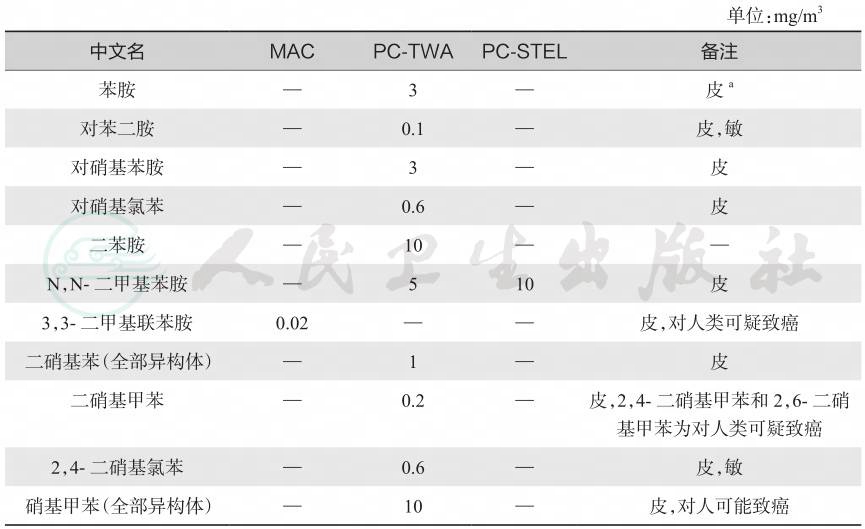 表9-1工业场所空气中部分苯的氨基及硝基化合物浓度限值 单位:mg/m3