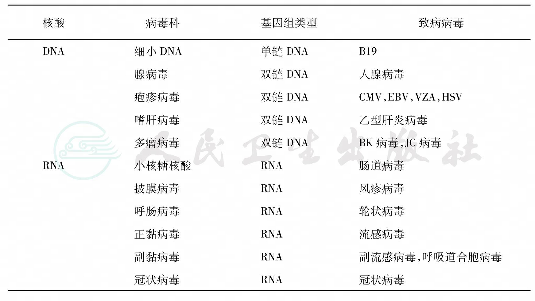 引起HSCT后病毒感染的病原按核酸类型可分为DNA病毒和RNA病毒(表1)。移植后病毒感染常见病原体包括:疱疹病毒(CMV、EBV、HSV、VZV等)、肝炎病毒(乙型肝炎病毒、丙型肝炎病毒等)、社区获得性呼吸道病毒(流感病毒、副流感病毒、呼吸道合胞病毒等)等。移植后患者由于免疫功能低下,其病毒感染发病率和严重程度远远高于正常人群。影响移植后病毒感染的因素包括供者及干细胞来源、HLA配型、预处理方案、GVHD预防方案以及移植后免疫抑制剂应用、GVHD等。Allo-HSCT患者因移植后需使用免疫抑制剂预防GVHD,其病毒感染的发生率高于auto-HSCT;接受无关供者和HLA不相合供者移植的患者因高强度的免疫抑制剂预防GVHD和移植后高GVHD的发生率,其移植后病毒感染发生率高于HLA完全相合同胞供者移植的患者。流感、副流感和呼吸道合胞病毒等社区获得性病毒具有季节性流行的特征,疱疹病毒感染发病率与移植后机体免疫状态密切相关,而肝炎病毒多与血液传染有关。