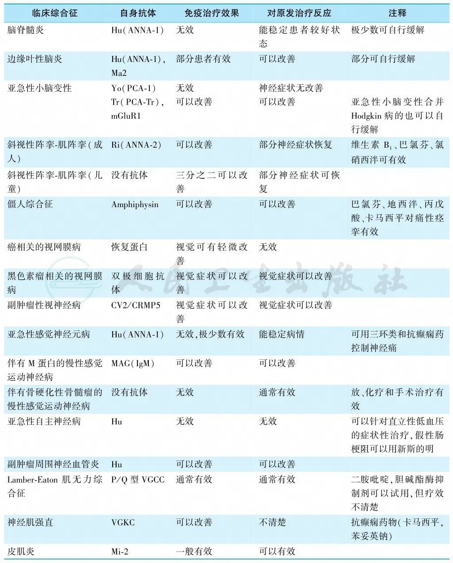 治疗的基础是发现原发肿瘤并及早手术治疗,除了表1中列出的方案外,有报道血浆交换也可以稳定病情。