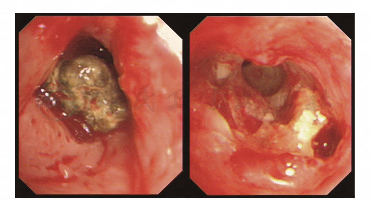 注:支气管腔内见灰黑色类圆形物,质硬,以及取出后管壁的情况。