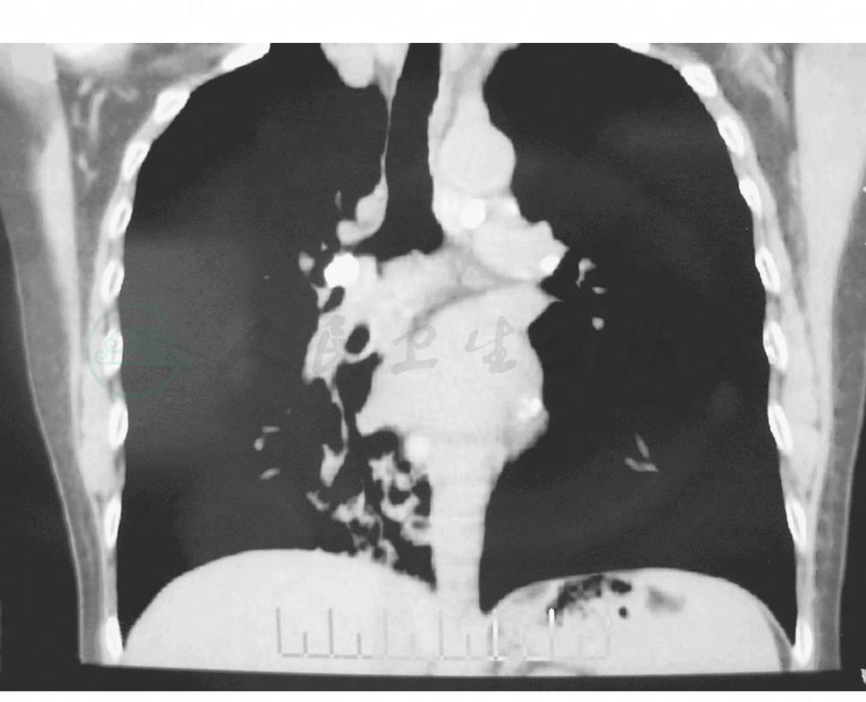 注:右中间支气管可见有类圆形高密度影从管壁向管腔突入。