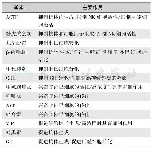 由上表可知,参与免疫功能调节的激素很多。对某种免疫功能或免疫物质来说,均存在兴奋和抑制两方面激素的调节,但在应激状态下,以抑制免疫功能的激素占优势。此外,应激时机体产生一类免疫抑制因子。许多激素、细胞因子和免疫因子均有抑制免疫和增强氧化应激功能。因此,应激性免疫功能紊乱是神经内分泌、局部激素与细胞因子调节障碍所致,与自由基的过氧化作用(见下述)有关。在局部组织,免疫细胞还合成和分泌旁分泌与自分泌激素,参与免疫调节或作为免疫反应的应答。这些由免疫细胞产生的局部激素在免疫病理反应中起着十分重要的作用,当生成量过多时,可损伤靶组织。
