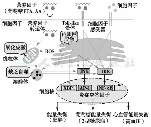 过度营养引起血糖、游离脂肪酸和氨基酸升高,诱导中枢性代谢性炎症;这些营养物质进入细胞内,线粒体和内质网在氧化营养物质和合成蛋白质时引起应激反应[19,20]。细胞内的反应性氧族增加,引起细胞内氧化应激。在此种环境中,细胞的高代谢状态需要内质网合成更多的蛋白质,因此导致内质网应激和细胞自噬。上述的线粒体应激、内质网应激、细胞自噬和炎症反应激活前炎症性激酶,如 IκB 激酶(IKK)和 c-Jun N 末端激酶(JNK),炎性细胞因子损害细胞结构和功能,引起能量代谢调节障碍和代谢综合征(图3)。