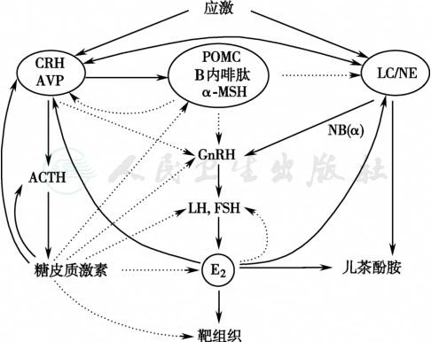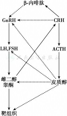 无论在急性、亚急性或慢性应激情况下,HPA轴兴奋均可导致HPG轴的功能抑制。在临床上,引起神经精神症状、月经紊乱、闭经、性欲减退、阳痿、精子生成减少和不育症等,其中以生育期女性的HPG轴功能紊乱表现最为突出。应激所致性腺功能减退或功能紊乱的原因很多,以下丘脑GnRH的脉冲性分泌功能丧失最明显。应激状态下,HPG轴功能抑制主要与HPA轴兴奋有关,表现在:①应激性闭经、神经性厌食或剧烈运动妇女的皮质醇分泌增多,昼夜节律仍存在,脑脊液中CRH浓度升高;②使用外源性CRH后,卵巢切除动物表现为GnRH和LH的脉冲性分泌消失;③使用IL-1和内毒素等应激物质后,HPA轴被兴奋,同时可见HPG轴功能抑制(LH和FSH的脉冲性节律消失,分泌量下降);④位于GnRH脉冲发生器附近的β-内啡肽分泌增多,使用阿片样肽受体拮抗剂则使GnRH脉冲性分泌功能迅速恢复,而纳洛酮或纳曲酮可拮抗应激对HPG轴的抑制。这提示,β-内啡肽至少是联系HPA轴(CRH)与HPG轴(GnRH)的应激性调节物(神经调质)之一。