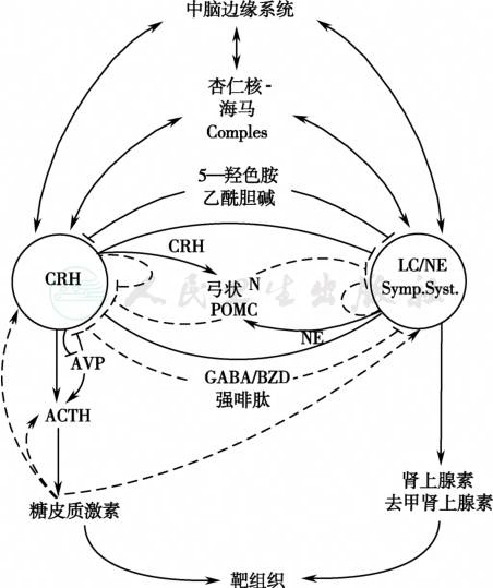 在应激过程中,下丘脑以外的边缘系统、前脑基底部、脑干交感系统和脊髓等可分泌CRH,其在协调应激反应中的作用广泛。在应激系统中,中枢的蓝斑/去甲肾上腺素神经元(LC/NE)和CRH神经元两者之间存在着反射性相互作用。室旁核的CRH神经元和脑干的NE神经元均有自身超短负反馈的神经纤维联系和功能联系,分别通过突触前CRH及α2-去甲肾上腺素能受体抑制CRH及儿茶酚胺的分泌。γ-氨基丁酸/苯二氮䓬(γ-amino-butyric-acid/benzodiazepine,GABA/BZD)及阿片肽样神经元系统(opioidpeptide-neuronal-system)的抑制性传入信号产生应激行为和适应性反应。另外,P物质和NPY亦有相互作用。P物质抑制CRH神经元而兴奋LC/NE交感系统。应激时,CRH和AVP呈比例增加,慢性炎症和疼痛时中枢神经的P物质升高,使机体状态在应激系统的激活中得到适当的改善。