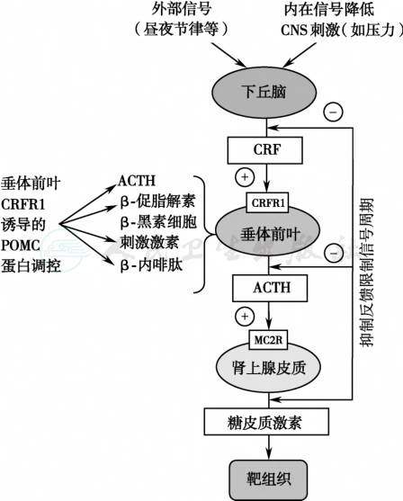 HPA轴是机体应激的主要反应系统;应激时下丘脑释放CRF,通过血液进入垂体,与其受体CRFR1结合后激活CRFR1,促进POMC分解和ACTH生成;ACTH在肾上腺与MC2R结合,刺激糖皮质激素(人类主要是皮质醇,动物主要是皮质酮)释放;而糖皮质激素反馈抑制CRF和ACTH释放