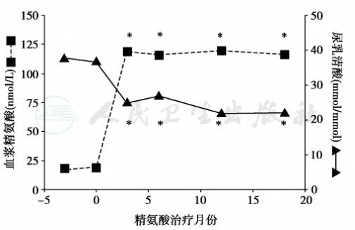本图显示7例迟发型鸟氨酸氨甲酰基转移酶缺陷症患者应用精氨酸治疗的血浆精氨酸与尿乳清酸变化,对照组血浆精氨酸99nmol/L,尿乳清酸3mmol/mmol肌酐