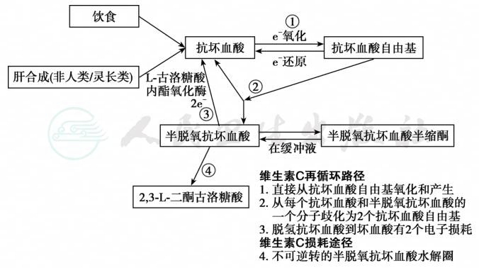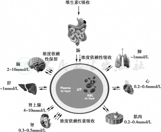 摄入的维生素C在肠道吸收,经血液转运到各种组织发挥生理作用后,由肾小球过滤的维生素C被重吸收,其余部分自尿液排泄;组织中的维生素C浓度由上述各种代谢因素决定