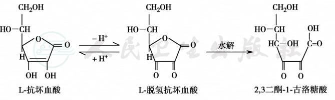 维生素C(vitamin C)又名抗坏血酸(ascorbic acid,ascorbate),是一种含6个碳的α-酮基内酯的弱酸。抗坏血酸可进行可逆性氧化,即在抗坏血酸酶的作用下脱氢,转化为脱氢抗坏血酸(dehydroascorbic acid),而后者可经还原反应形成中间产物,并最终生成抗坏血酸,从而在体内形成氧化还原系统。脱氢抗坏血酸在水溶液中不稳定,可经不可逆的水解作用使其维生素C环状结构断裂而生成二酮古洛糖酸(diketogulonic acid),进而代谢为草酸盐、苏氨酸盐、木糖、木糖酸以及来苏糖酸。自然界中的抗坏血酸存在L型和D型两种,D型抗坏血酸无生物学活性。抗坏血酸分子的结构式及主要代谢反应见图1。