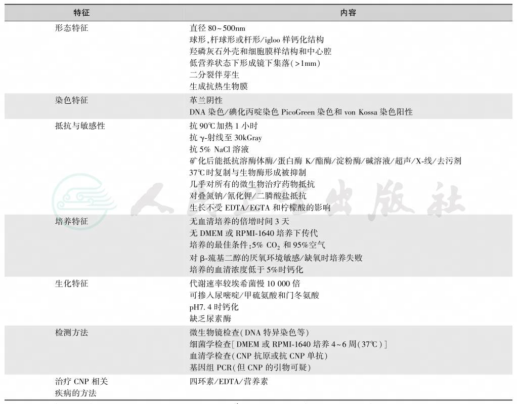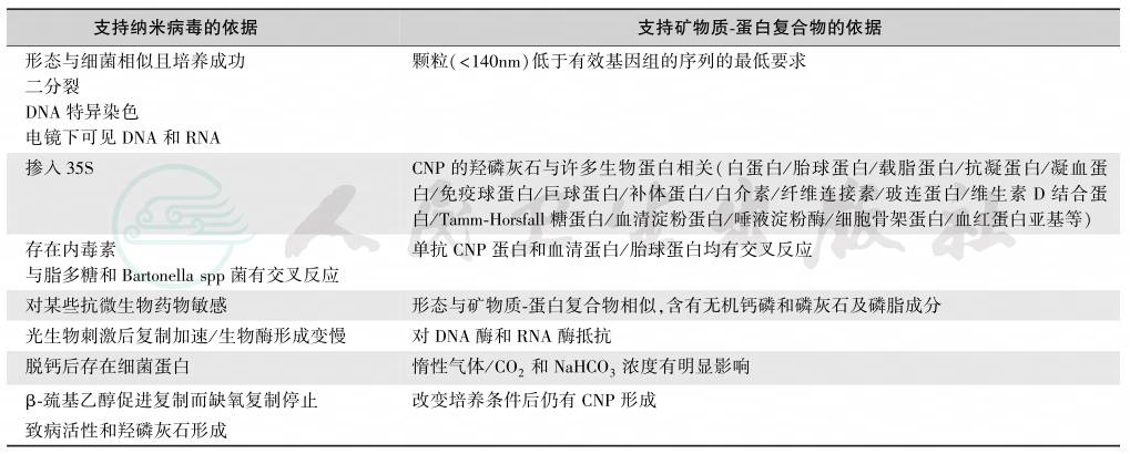 钙化性纳米颗粒(calcifying nanoparticles,CNP)是一种纳米级的微小物质,又称为纳米菌(nanobacteria)、纳米菌样颗粒(nanobacteria-like particle,nanobe),其特征见表2。但是,CNP的性质仍不明确,是否属于地球上能自身繁殖的最小生物或仅仅是一种矿物质-蛋白质复合物未定。因为到目前为止,两种说法都有支持和反对的依据(表3);但是CNP与人类的某些疾病是相关的,其中特别是肾钙盐沉着症、肾石病和血管钙化(表4)。