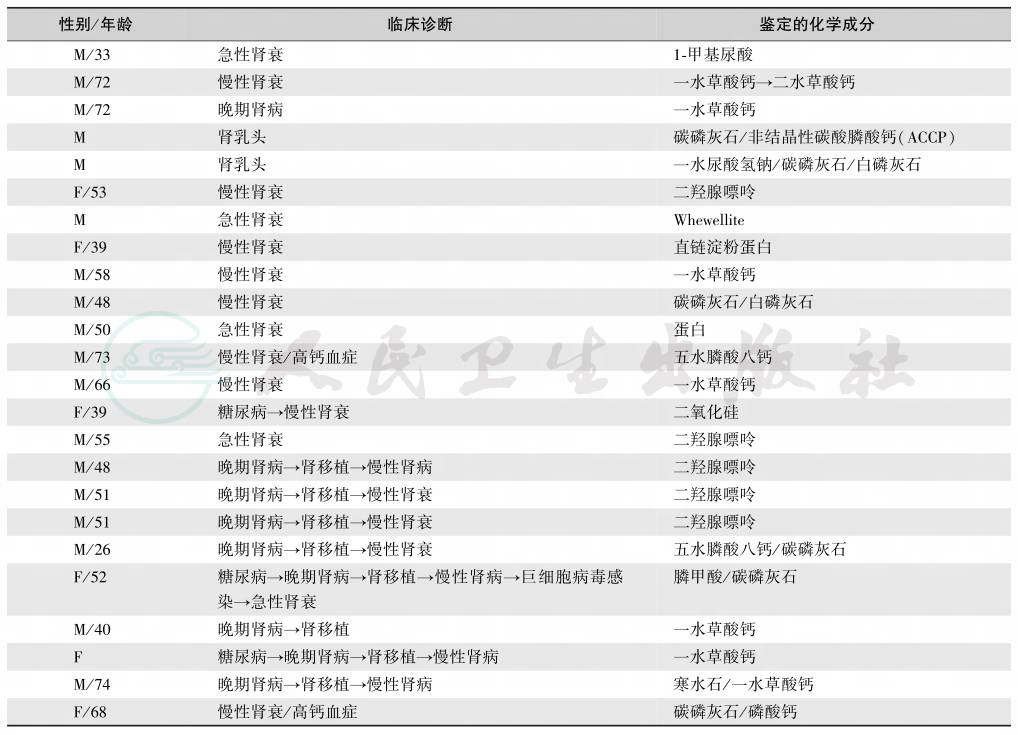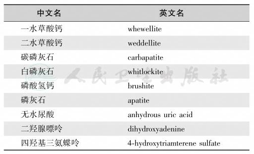 矿物质晶体形成是许多遗传性疾病和后天性病变的重要并发症,较常见于原发性高草酸尿症、腺嘌呤膦酸核糖转移酶缺陷症、远端肾小管酸中毒、Dent病、原发性甲状旁腺功能亢进、Sjögren综合征、维生素D过量与中毒、乙二醇中毒等。肾钙盐沉着症是根据von Kossa和alizarin染色后的颜色变化来确定的,阳性表示组织内存在草酸钙或磷酸钙沉积,但不能将一水草酸钙(whewellite)、二水草酸钙(weddellite)、白磷灰石(whitlockite)、磷酸氢钙(brushite)与磷灰石(apatite)区别开来。Estepa-Maurice等从肾活检标本中鉴定了肾矿物质盐的七种化学相,见表6。