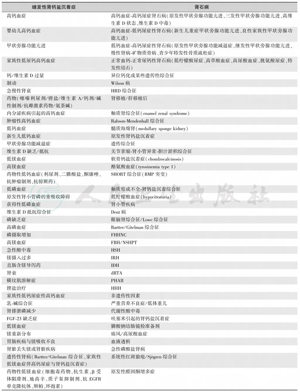 引起肾钙盐沉着症的病因复杂,发病机制未明。通常情况下,肾钙盐沉着症主要是全身性矿物质代谢紊乱(高钙血症、低钙血症、低磷血症、高磷血症、低镁血症、高镁血症)、肾石病、异位钙化或某些遗传性综合征的一种表现,常伴有其他软组织(脑实质、血管等)钙盐沉着症,临床上可以称为继发性肾钙盐沉着症(secondary nephrocalcinosis);单独存在的原发性肾钙盐沉着症(primary nephrocalcinosis)少见,可以是继发性肾钙盐沉着症的早期表现,但多数与肾小管二价阳离子(Ca2+和Mg2+)的代谢缺陷或遗传综合征有关。肾小管二价阳离子代谢缺陷症见于家族性低镁血症伴高钙尿症和肾钙盐沉着症(FHHNC)、家族性良性高钙血症(FBH)、新生儿重症甲状旁腺功能亢进(NSHPT)、低镁血症-继发性低钙血症(HSH)、单纯性常染色体隐性遗传性低镁血症(isolated autosomal-recessive hypomagnesaemia,IRH)、单纯性显性遗传性低镁血症(IDH)、远曲肾小管性酸中毒(dRTA)、Ⅱ型假性甲状旁腺功能减退症(PHAII)、低镁血症-高血压-高胆固醇血症综合征(HHH)等。原发性肾钙盐沉着症可见于Bartter/Gitelman综合征、Dent病、眼-脑-肾综合征/Lowe综合征、软骨钙盐沉着症(chondrocalcinosis)、低柠檬酸血症(hypocitraturia)、关节挛缩-肾小管异常-胆汁淤积综合征、釉质形成不全-肾钙盐沉着综合征、酪氨酸血症、SHORT综合征(BMP突变)等(表1)。
