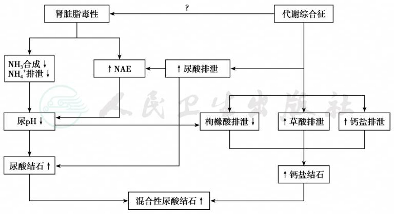 环境因素主要有高盐饮食、高蛋白饮食、酸负荷、低柠檬酸尿症、钙剂摄入过多,泌尿系统感染、不健康生活方式等。例如,代谢综合征并发肾钙盐沉着症的危险因素包括高尿酸血症、高钙尿症、高草酸尿症和低枸橼酸尿症。尿pH值降低也加重高尿酸血症、高钙尿症、高草酸尿症和低枸橼酸尿症(图1)。
