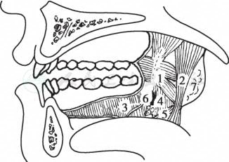 1.咽上缩肌 2.舌腭肌 3.下颌舌骨肌 4.翼内肌5.茎突舌肌 6.舌神经 7.扁桃体