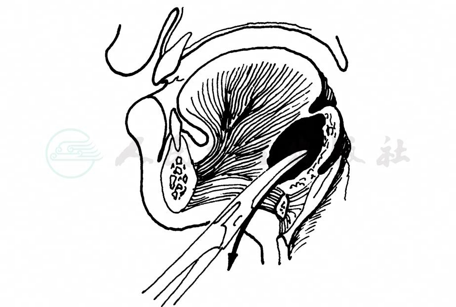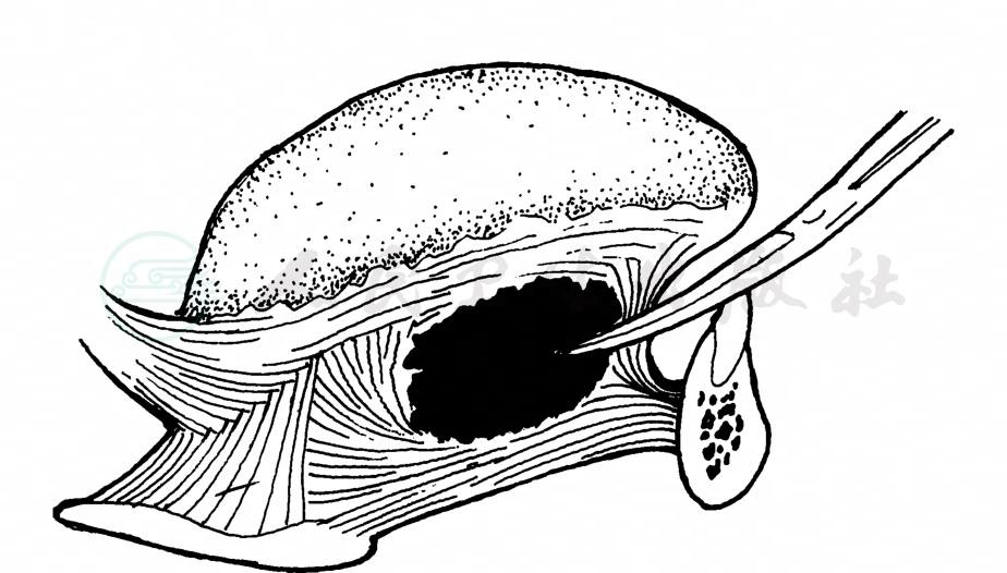 可选舌下区正中垂直切口,切开黏膜后钝分离到肌间隙中;也可做颏下皮肤横切口,向上钝分离到颏舌骨肌和颏舌肌之间的脓腔(图2)。