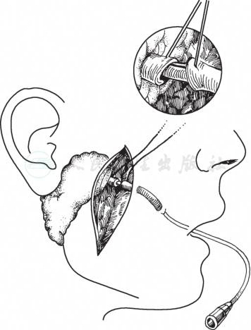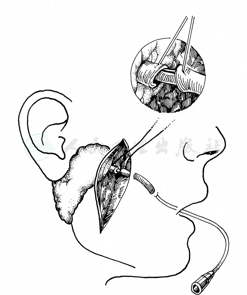 从腮腺导管口插入聚乙烯导管,并进入近心端,然后缝合导管