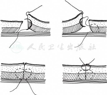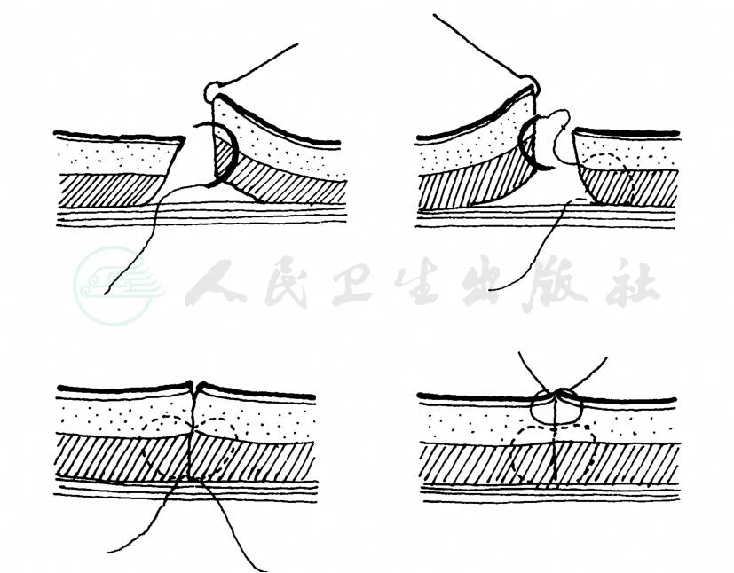 皮肤边缘应准确对位缝合。缝合时使两侧皮肤边缘稍外翻,应避免内翻。