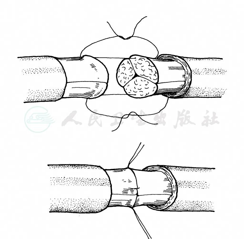 通常,可将腮腺导管断裂分为三种情况处理。近心端(近腺体)的损伤修复困难,因壁薄,有时有一层腮腺组织包绕。修复困难时,可将断裂的两端分别结扎,使腮腺萎缩。结扎后,如腺体长期肿胀及疼痛,可辅以放射治疗,此种情况少见。咬肌浅面导管断裂时,以图12-3所述方法修复。咬肌远端 (近口腔端)部位导管断裂时,直接缝合困难。可将远心端结扎,近心端斜行向下,穿过颊肌,引入口腔,在颊黏膜上作一开口并缝合于其上,插入聚乙烯导管并固定于颊黏膜。