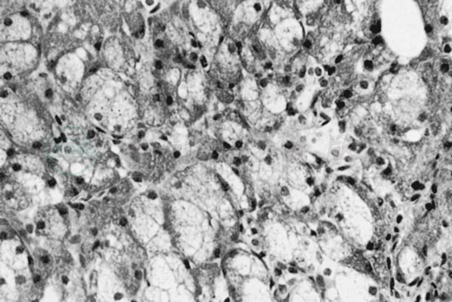 主要病变见于浆液性腺泡,光镜下见浆液性腺泡增大,约为正常腺泡的2~3倍,腺泡细胞之间界限不清,融成一片,腺泡细胞的胞质内有许多小空泡形成,腺泡细胞顶端的酶原颗粒消失;胞核比正常小,位于细胞基部。闰管及分泌管一般均正常。间质结缔组织可出现玻璃样变和水样变性,有的腺泡消失而被脂肪组织所取代(图1)。