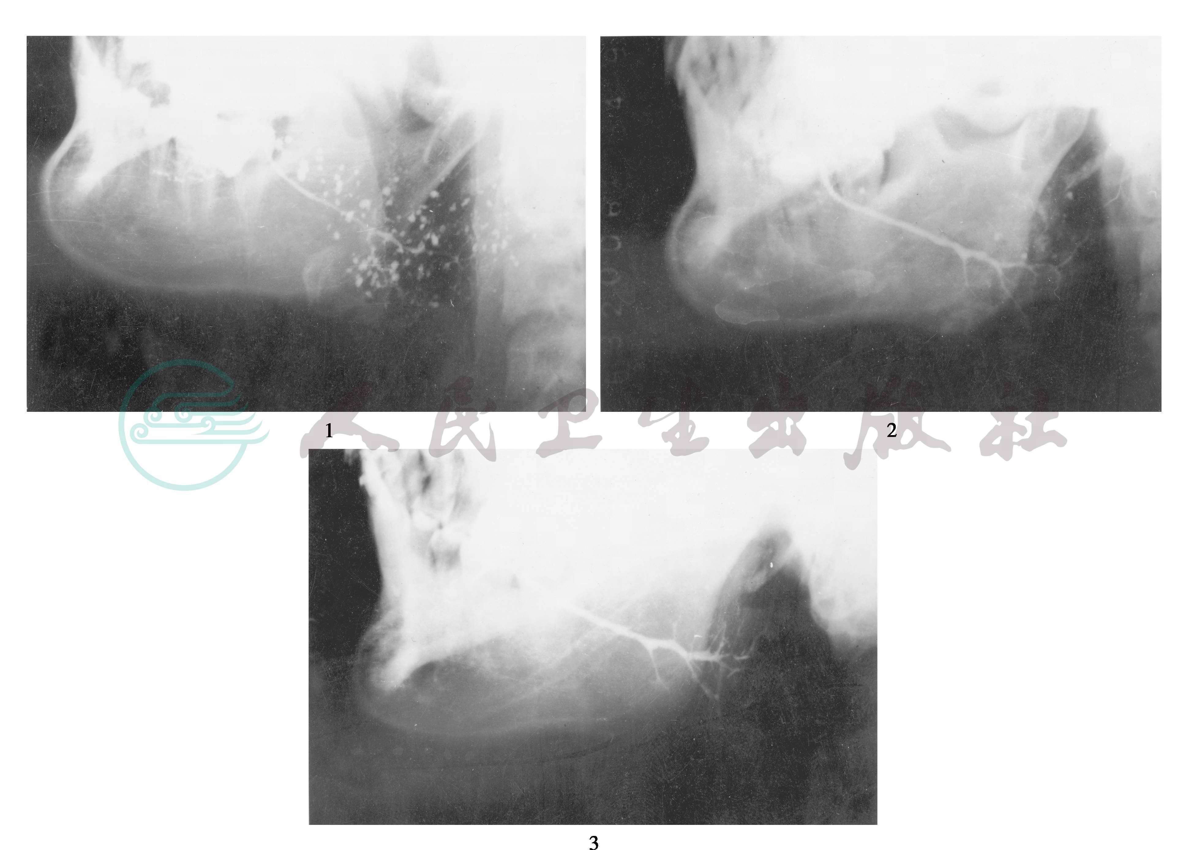 腮腺造影的表现类似于儿童复发性腮腺炎,但有部分患者可痊愈,X线片上点扩完全消失。部分患者明显好转,X线片上点扩数减少50%以上 (图1)。
