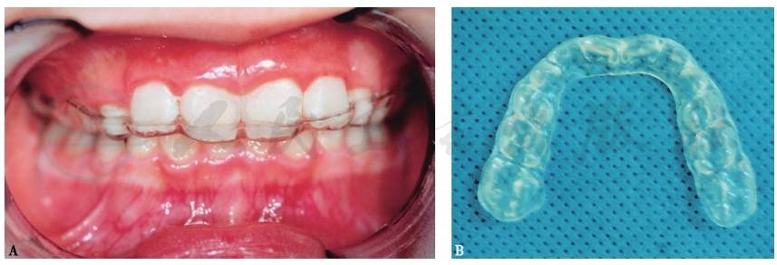 A.全牙列𬌗垫及其配戴于部分脱出的患者 B.全牙列𬌗垫