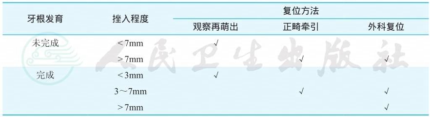 对于牙根发育成熟的挫入牙齿,挫入较少时,可以观察其再萌出,如果没有再萌出迹象,应在发生牙齿固连前,采用正畸牵引的方法,使该牙复位;对于挫入较多的牙(7mm以上),可用拔牙钳即刻钳出挫入的部分,复位固定。